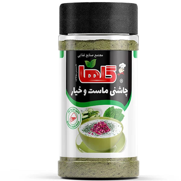 چاشنی ماست و خیار چاشنی ماست و خیار گلها تشکیل شده است از نمک، نعنا، موسیر، گل سرخ، آویشن، تخم گشنیز، سیر، فلفل قرمز و زیره. عطر خوب این چاشنی ناشی از ترکیب سبزیجات معطر گل سرخ، آویشن، نعنا و زیره است که در ترکیب با تخم گشنیز و سیر طعمی خوب و دلخواهی به ماست و خیار شما می دهد. 30 درصد این چاشنی از نمک تهیه شده است پس در هنگام صرف ماست و خیار نسبت به پاشیدن نمک برای حفظ سلامتی خود توجه بیشتری به عمل بیاورید. مجتمع صنایع غذایی گلها بسته بندی این چاشنی 70 گرمی را بسیار سبک و خوش دست طراحی کرده، که یکی از اهداف مقرون به صرفه بودن محصولات مجتمع صنایع غذایی گلها می باشد. این محصول ظرفی شبیه به نمک پاش دارد که سر آن با دو حالت ریزپاش و درشت پاش طراحی شده که استفاده از آن را راحت کرده است. پیشنهاد گلها برای تهیه ماست و خیار بهتر است از رنده استفاده نکنید و خیار را به صورت نگینی خورد کنید، چرا که طعم و مزه بهتری به ماست و خیارتان می دهد. ماست را به تنهایی هم می توان در کنار غذا صرف کرد، اما چه بهتر آن را با مواد مختلف طعم دار کرد. خیار از سبزیجاتی است که طعم خنک و عطر خوب آن در ماست تاثیر زیادی میگذارد و به خوبی محسوس هست، ترکیب سبزیجات معطر نظیر نعنا، گل سرخ و آویشن ماست را بسیار خوش مزه و خوش عطر می کند. در زمان های قدیم هم ایرانیها آن را با یکسری موادی ترکیب میکردند. این مواد میتوانست اسفناج یا بادمجان باشد که ماست را به برانی تبدیل کند، یا میتوانست ادویه یا سبزیجات خشک باشد. تهیه ماست و خیار در نقاط مختلف کشور به صورت های گوناگونی انجام می شود. در بعضی مناطق کشمش و گردو هم اضافه می کنند.
