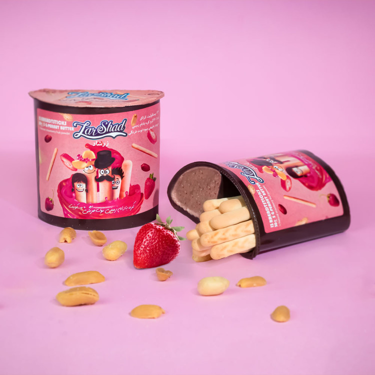 ترکیبات: بادام زمینی - شکر - امولسیفایر - نمک - پودر میوه توت فرنگی - بیسکوئیت