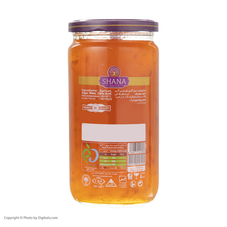 مربا زردآلو شانا، 830 گرم وزن دارد و در قوطی های شیشه ای بسته بندی شده است. شانا برای آسان تر باز شدن این مربا، بستهبندی آن را به شکل استوانهای استفاده کرده است تا به آسانی باز شود. حاوی 55.54 کیلوکالری انرژی بوده و فاقد اسیدهای چرب ترانس است. مربا زردالو شانا ترکیبی از زردآلو، شکر، اب و اسیدسیتریک بوده که یک مربا خوش مزه و لذیذ را تشکیل می دهند. این مربا به عنوان یک میان وعده خوش مزه و سالم، انرژی مورد نیاز بدن را تامین می کند.