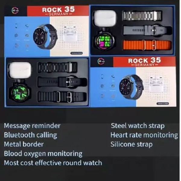 ساعت هوشمند ROCK 35 GERMANY یکی از کاربردی ترین ساعت های هوشمند موجود در بازار است. این ساعت دیجیتال دارای سه مدل بند مختلف است که به همراه یک ایرپاد ارسال میشود. این ساعت دارای برنامه های متنوع و کارامد از جمله بلوثوت, فشار خون سنج , ضربان قلب و تمامی اپلیکشین هایی که برای سلامت بدن طراحی شدن هست. این ساعت میتواند به صورت مستقیم از طریق بلوتوث به گوشی متصل شود و همچنین دارای بارکد است که با اسکن ان به گوشی متصل میشود و میتوانید دیتای کامل ساعت را در گوشی خود مشاهده کنید. از جمله برنامه های دیگر ان دستیار هوشمند و ماشین حساب , اب و هوا , بازی و تایمر همچنین دارای زبان های متنوع و منوی زبان فارسی نیز است.