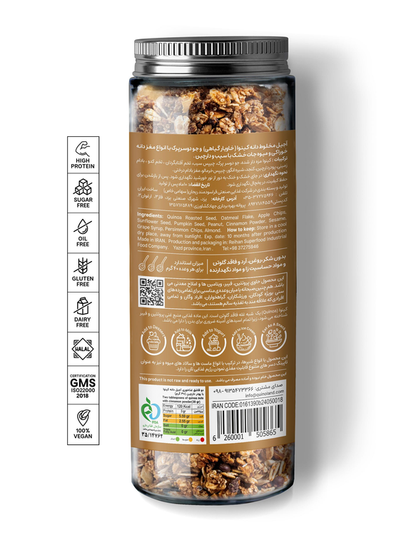 این گرانولا بدون هیچگونه نگهدارنده یا رنگ مصنوعی تولید شده و با فیبر بالا، چربیهای مفید و مواد معدنی غنی، به بهبود عملکرد دستگاه گوارش و افزایش انرژی روزانه کمک میکند. برای ورزشکاران، دانشجویان و افرادی که به تغذیه سالم اهمیت میدهند، یک انتخاب کامل محسوب میشود.