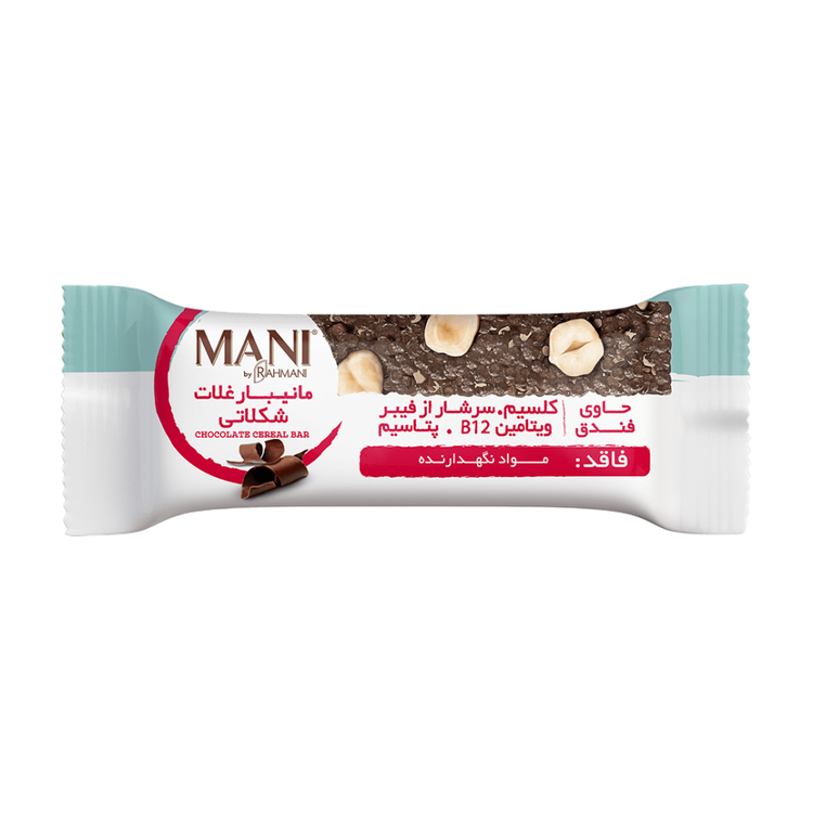 غلات بار شکلاتی مانی بار حاوی جودوسر ,فندق,شکلاتو عسل است.جودوسر سرشار از فیبر و ویتامین ب و بیوتین همینطور جو دوسر سرشار از آنتی اکسیدان است که باعث افزایش سیستم ایمنی و کاهش التهاب بدن میگردد.هچنین پودر کاکائو سرشار از انتی اکسیدان های فلاونوئید و فلاوانول است که موجب ازادسازی شسروتونین و تریپتوفان در بدن میگردد و باعث افزایش انرژی و هوشیاری میگرددهمچنین کافئین موجود در پودر کاکائو باعث افزایش ترشح دوپامین میشود که باعث افزایش سلول های مغذی و ایجاد حس خوشحالی و افزایش قدرت حل مسئله می گردد.