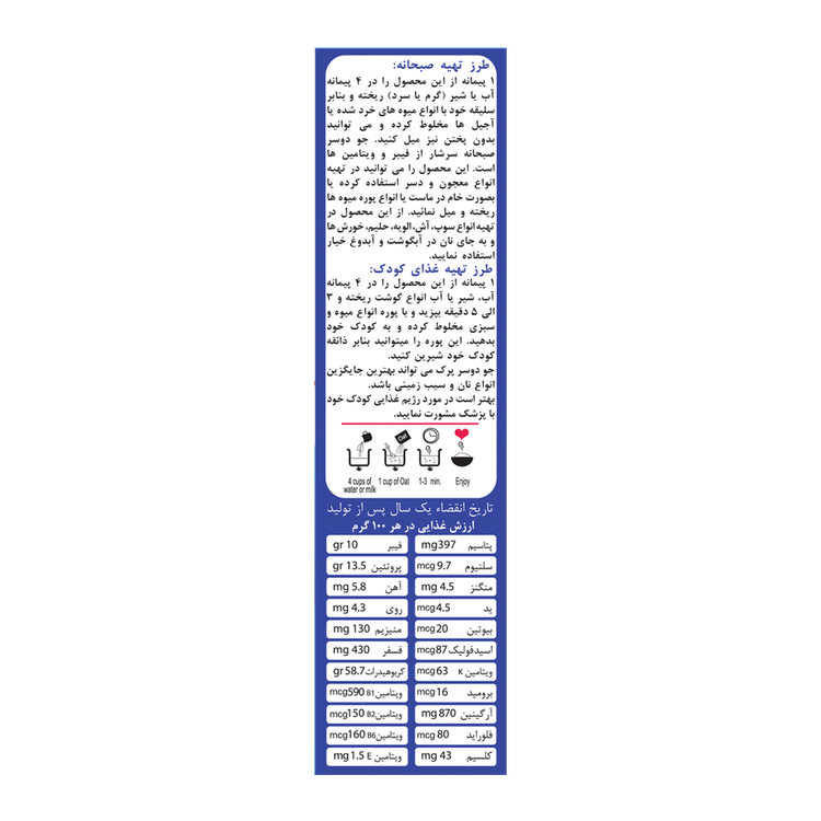 این محصول را میتوان با مقداری آب یا شیر مخلوط کرد و با میوه های مختلف ,عسل و آجیل مصرف کرد این وعده یک وعده کامل غذایی است و تمامی نیاز های بدن را پاسخگوست.
