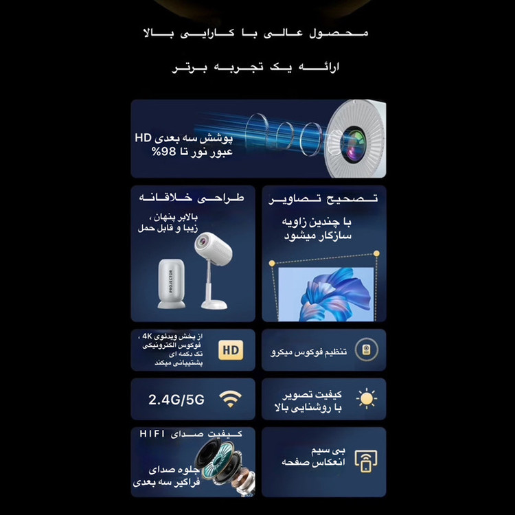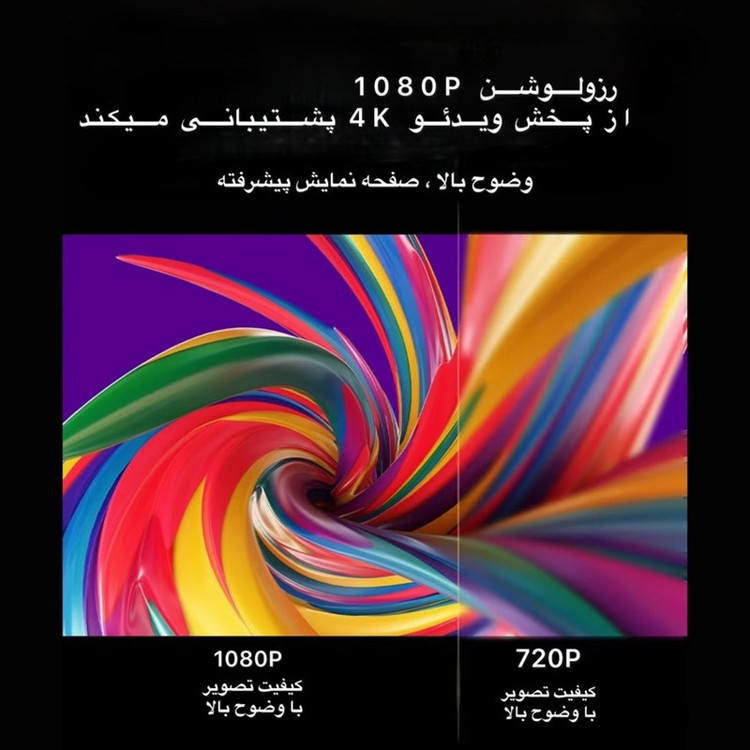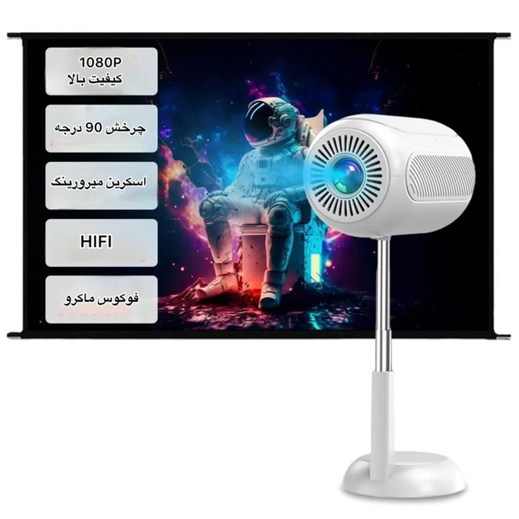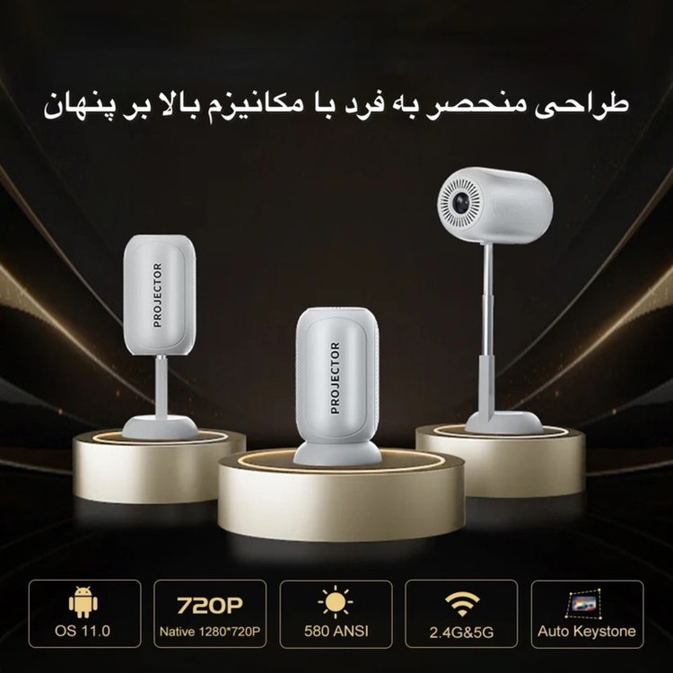 ویدئو پروژکتور مدل TS_6 نسل جدید ویدئو پروژکتورها با پشتیبانی از سیستم عامل اندروید ورژن 11 و قابلیت تغیر ارتفاع تلسکوپی می باشد.این ویدئو پرژکتور دارای سی پی یو قوی HI352 می باشد که باعث عملکرد عالی این دستگاه شده است.این ویدئو پرژکتور تصویری ابعاد تا 100 اینچ را برای شما فراهم می کند.لامپ به کار رفته در این پرژکتور 42 وات می باشد.با استفاده از اسپیکر 3 واتی صدای ایده آل خروجی برای شما فراهم شده است.صدای فن داخلی آن دارای نویز کمتر از 25 دسی بل است که ایده آل است.قابلیت تغییر زاویه 180 درجه باعث شده به راحتی تصویر را روی دیوار یا روی سقف برای شما ایجاد نماید.این پروژکتور دارای پورت USB و AUX و HDMI نیز می باشد.برق این دستگاه از برق شهری 110-220V تامین می شود.به جرات می توان گفت جدیدترین نسل ویدئو پرژکتور های موجود در بازار در اختیار شما قرار داده شده است.حافظه داخلی 8 گیگ و رم 1 گیگ برای این ویدئو پرژکتور تعبیه شده است.