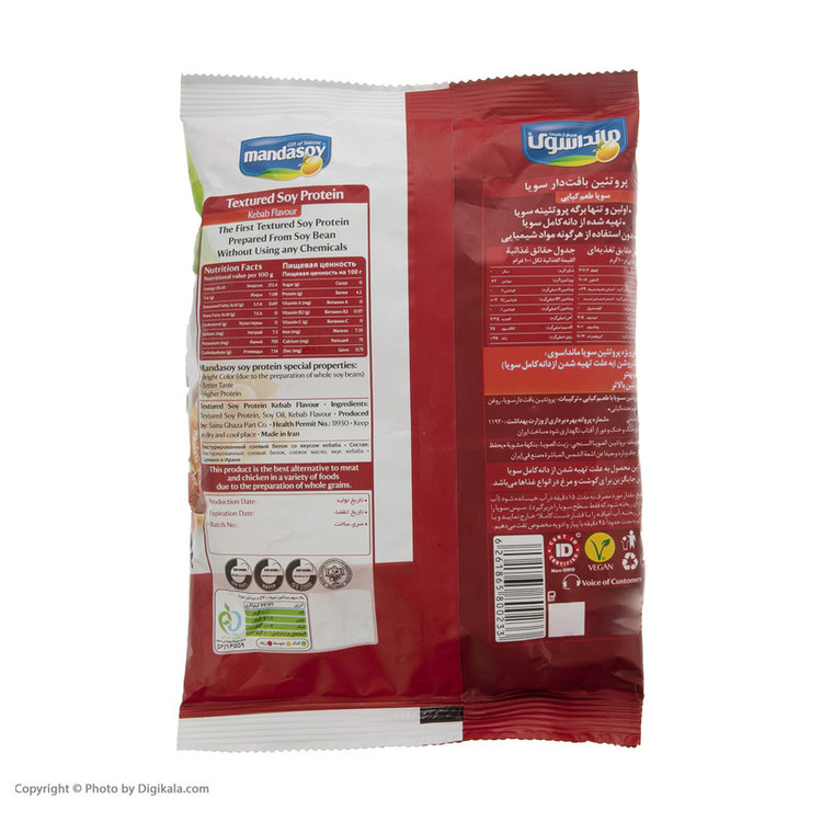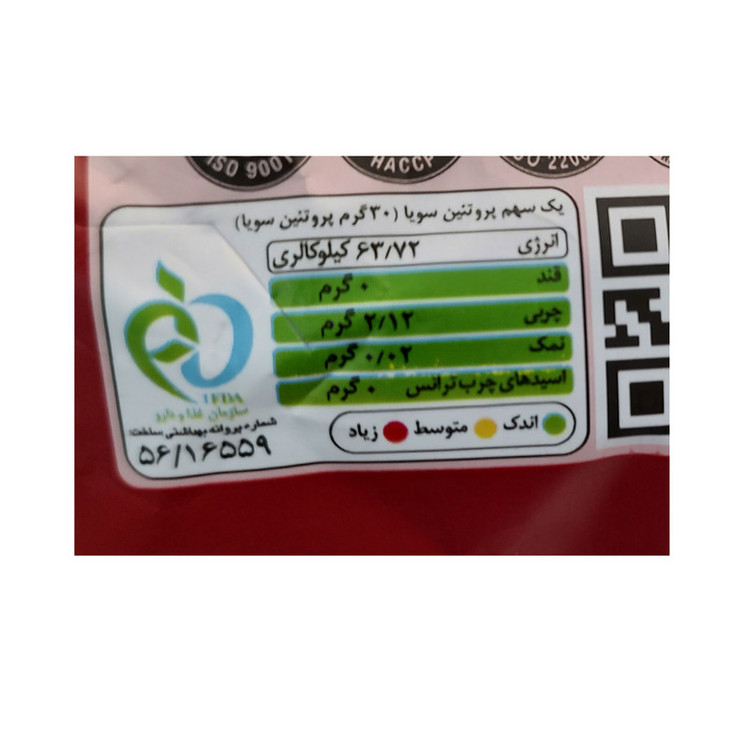 - پروتئین بافتدار سویا - سویا طعم کبابی - اولین و تنها برگه پروتئنه سویا - تهیه شده از دانه کامل سویا - بدون استفاده از هرگونه مواد شیمیایی - خواص ویژه پروتئین سویا: رنگ روشن (به علت تهیه شدن از دانه کامل سویا)، طعم بهتر و پروتئین بالا